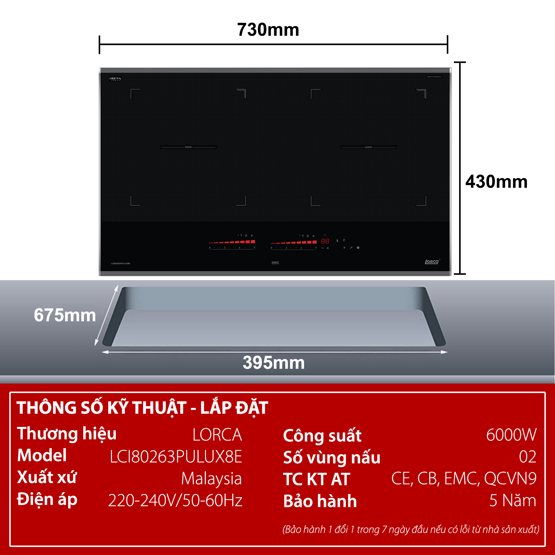 Bếp từ đôi Lorca LCI 80263 PULUX8E nổi bật với thiết kế âm sang trọng, tinh tế, phù hợp nhiều không gian bếp hiện đại. Sản phẩm trang bị 2 vùng nấu độc lập công suất mạnh mẽ, giúp nấu ăn nhanh chóng và tiện lợi cho gia đình. Mặt kính cao cấp chịu nhiệt, chống trầy xước tốt kết hợp bảng điều khiển cảm ứng nhạy bén mang lại trải nghiệm sử dụng mượt mà. Ngoài ra, bếp tích hợp các tính năng an toàn như khóa trẻ em, hẹn giờ và tự nhận diện vùng nấu, giúp người dùng yên tâm trong suốt quá trình sử dụng.