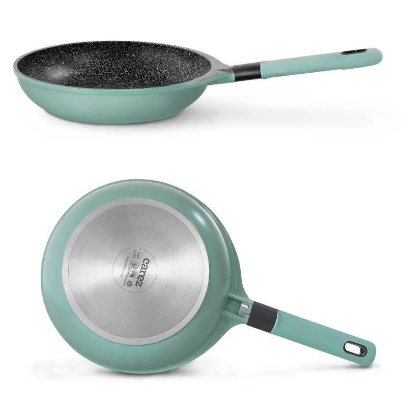 Chảo đúc vân đá Carez FPC581DI28SN sở hữu kiểu dáng hiện đại với thân và tay cầm màu xanh trẻ trung, kết hợp lòng chảo màu đen sang trọng, tạo điểm nhấn nổi bật cho gian bếp.