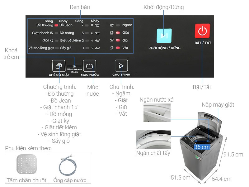 - 8 chương trình giặt đa dạng: Máy được trang bị nhiều chế độ giặt như giặt nhanh, giặt thường, giặt tiết kiệm, giặt đồ dày… giúp người dùng dễ dàng lựa chọn phù hợp với từng loại quần áo và nhu cầu sử dụng hằng ngày