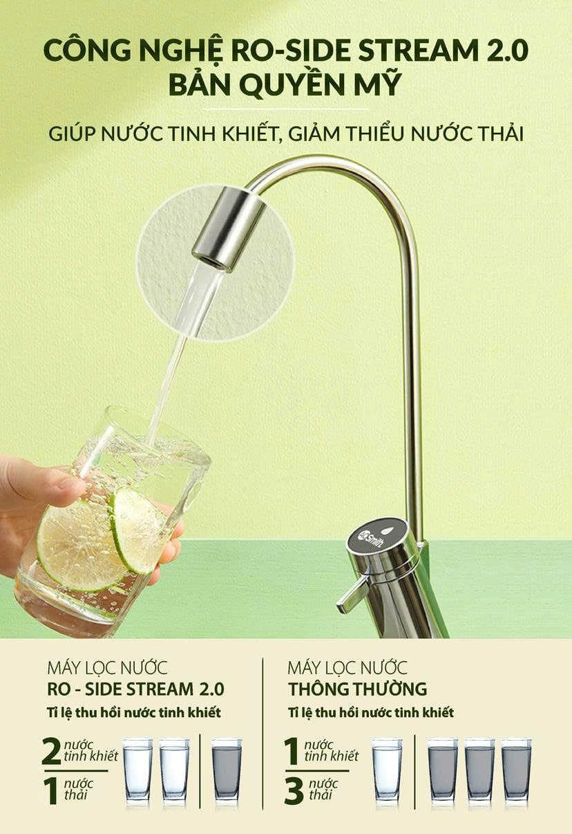 Công nghệ màng lọc RO – Side Stream, giúp tăng thêm 66% lượng nước tinh khiết, giảm 56% lượng nước thải