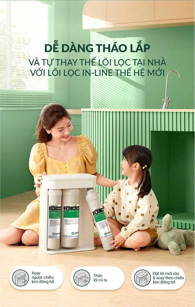 Dễ dàng thay thế: Thiết kế thông minh cho phép người dùng có thể tự tháo lắp và thay thế lõi lọc ngay tại nhà mà không cần đến kỹ thuật viên chuyên nghiệp.