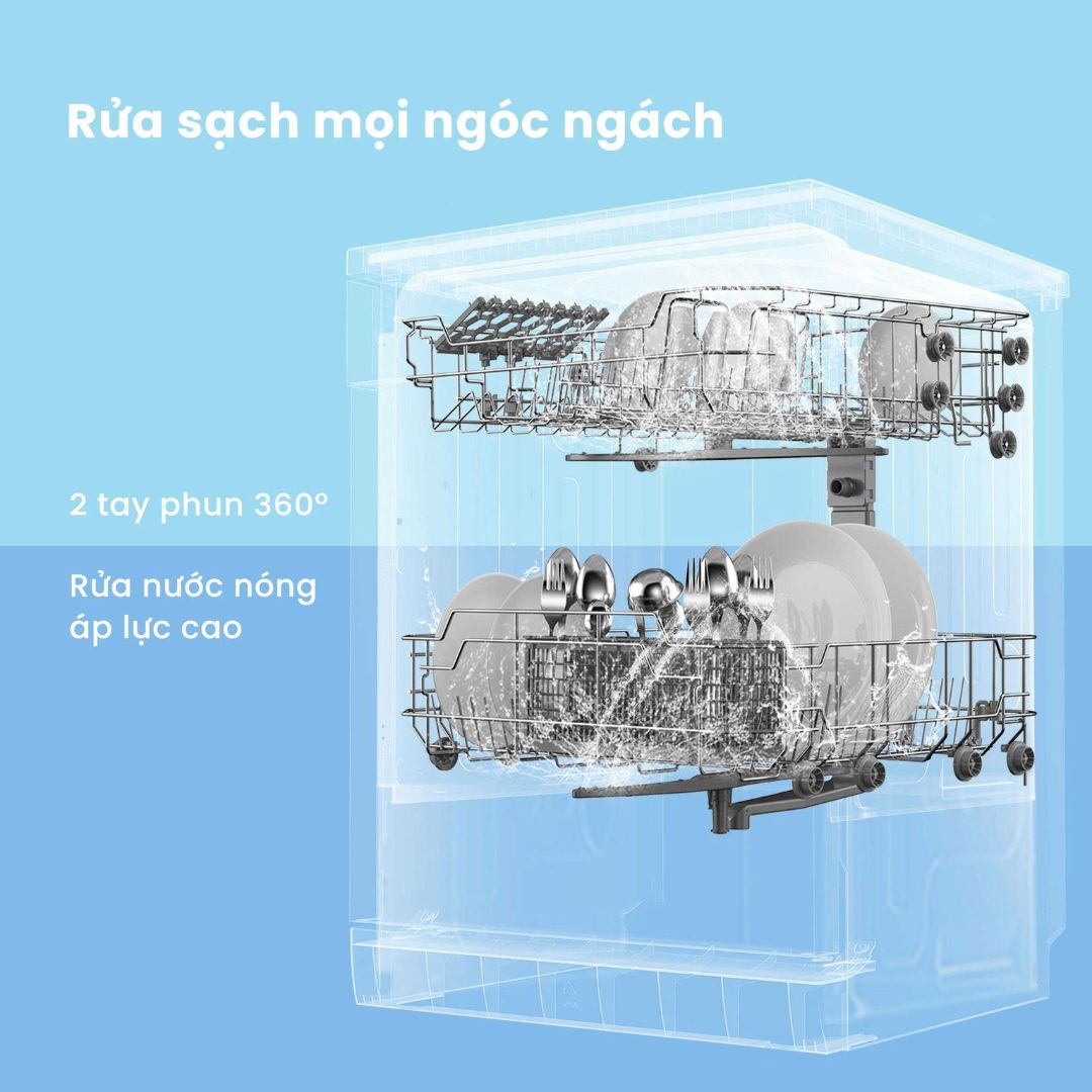 Công nghệ rửa nước nóng áp lực cao cùng tay phun 360° tạo luồng nước bao phủ toàn diện, giúp chén đĩa sạch tinh tươm mà bạn không cần lo lắng bất kỳ góc bẩn nào bị bỏ sót.