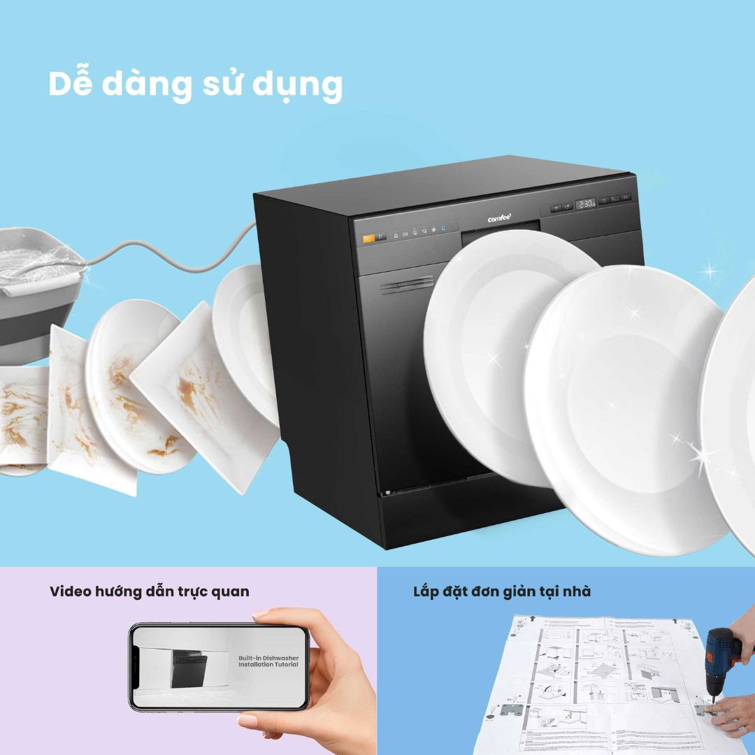Sở hữu máy rửa chén không hề khó như bạn nghĩ với Comfee, chỉ cần xem video hướng dẫn đã có thể tự lắp đặt tại nhà cực nhanh mà không cần kỹ thuật hỗ trợ.