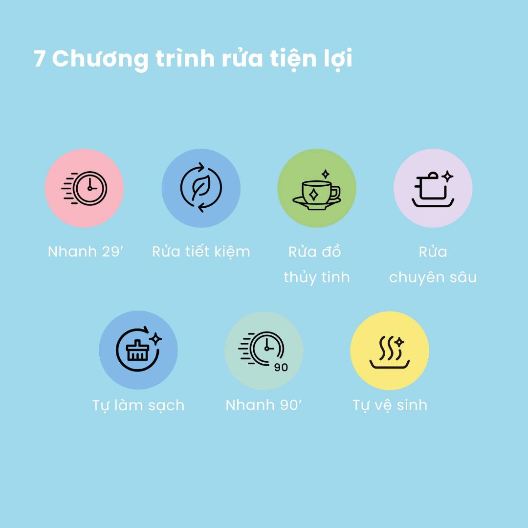 Trang bị 7 chương trình rửa vô cùng đa dạng và tiện lợi cho mọi mục đích sử dụng: