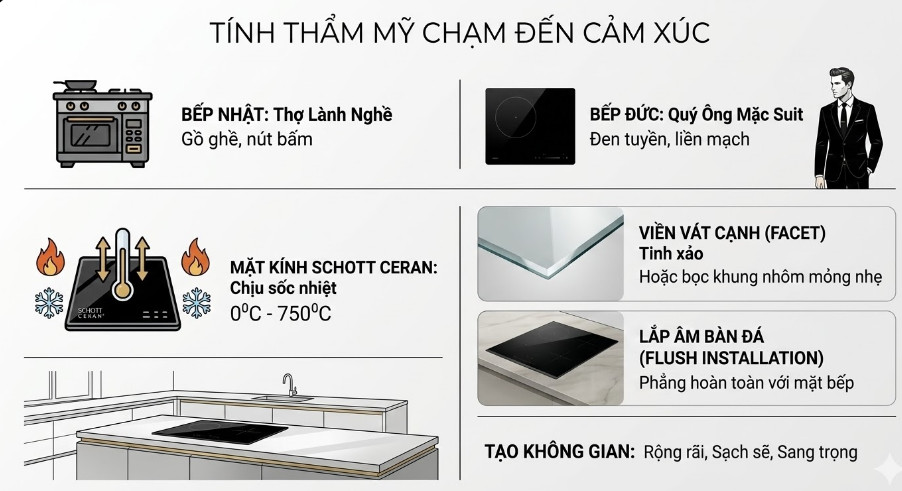 Nếu bếp Nhật là một người thợ lành nghề, thì bếp Đức là một quý ông mặc suit. Không có lò nướng gồ ghề, không có các nút bấm vật lý nổi cộm, bếp từ Đức thường là một khối kính đen tuyền liền mạch.