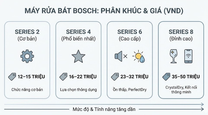 Bosch cũng có dòng 45cm (series SMS2 và SMS4), nhưng thế mạnh của Bosch nằm ở dải full-size 60cm với sức chứa 13–14 bộ.